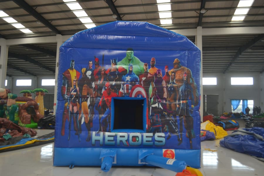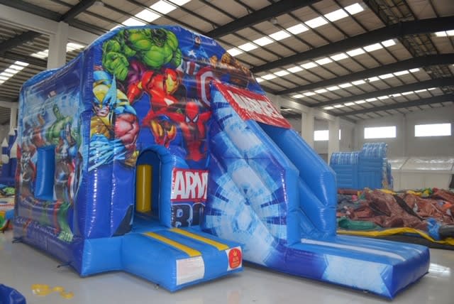 Our Marvel Combo, 12 wide by 21 long and 6 foot slide, these style combos are very popular hires, this style combo is excellent if we get a couple of showers and wind, the kids are protected from the elements and the combo will stay dry.
