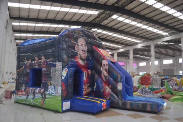 Our Barcelona Combo, 12 wide by 21 long and 6 foot slide, these style combos are very popular hires, this style combo is excellent if we get a couple of showers and wind, the kids are protected from the elements and the combo will stay dry.